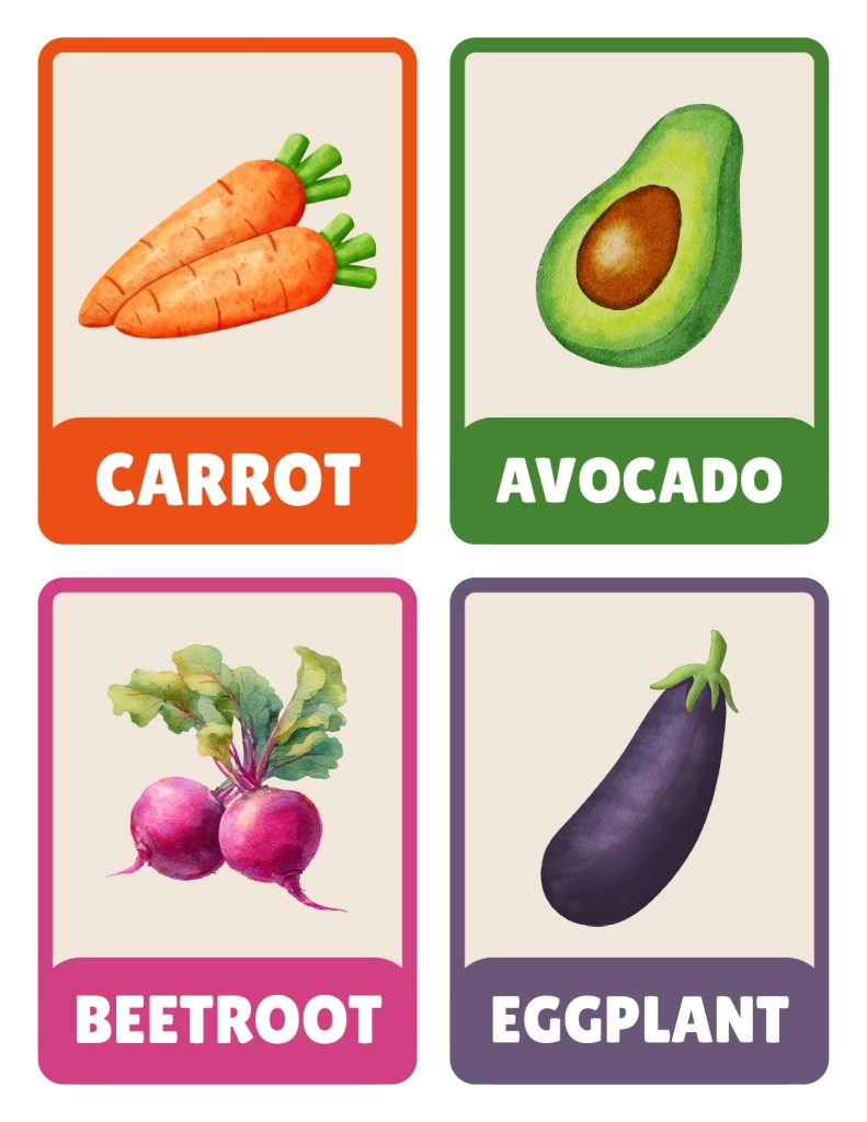 - Color Sorting Challenge: Separate cards by vegetable colors. All the green ones in one pile, red in another, orange in another. Kids discover most vegetables are green while fewer are red or purple. This visual sorting helps them remember vegetables by color when shopping or eating.