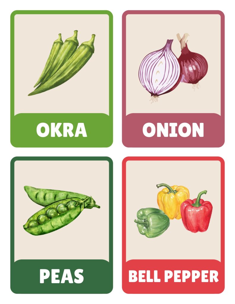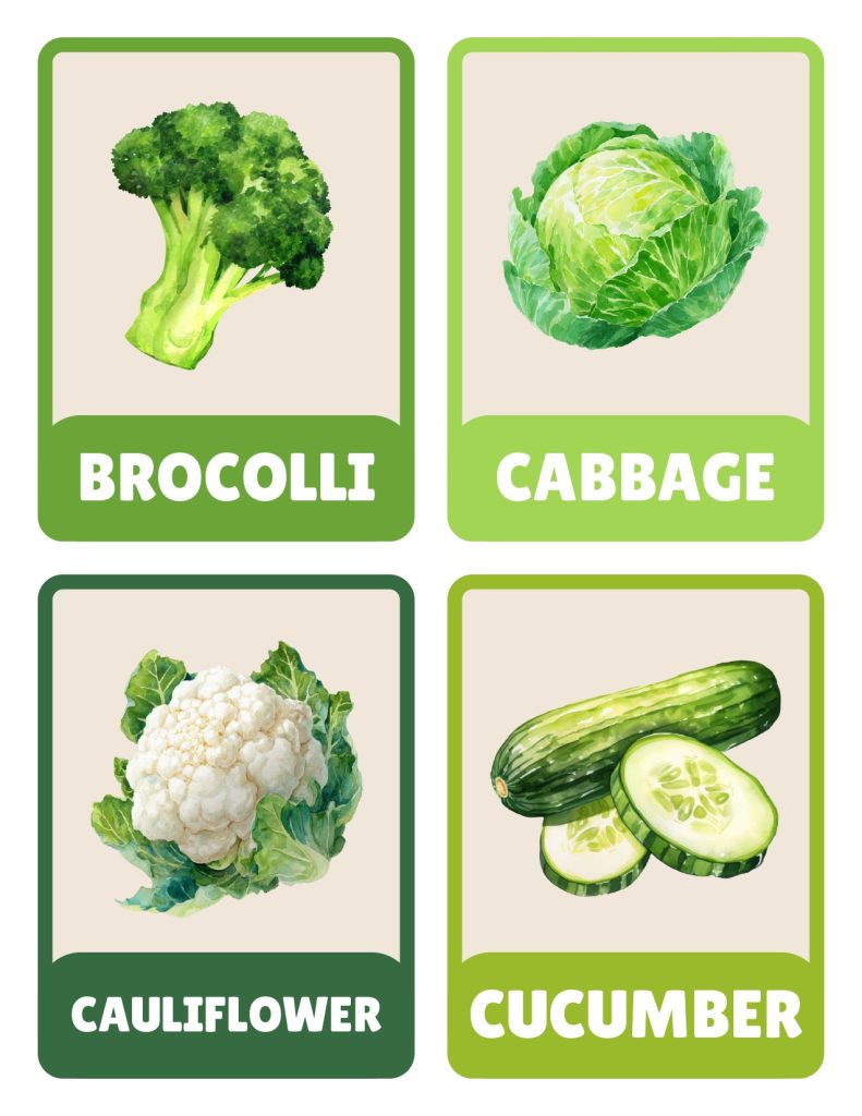 When children know what vegetables are called and what they look like whole, they get curious instead of suspicious. Oh, that’s the cucumber I saw on the flashcard. Those are the same green beans from the picture. Different vegetables have different colors, shapes, and textures, and they all do different jobs keeping bodies healthy and strong.