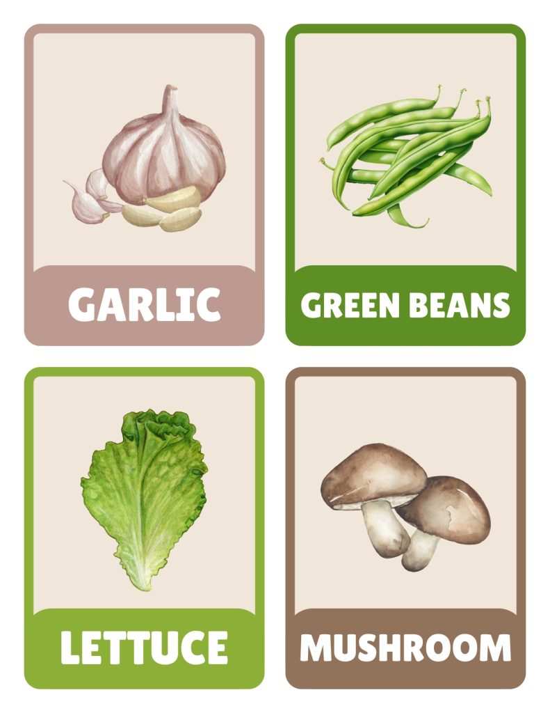 - Veggie Memory Match: Print two sets of cards and play classic memory match. Lay cards face down and flip two at a time trying to find pairs. Kids learn vegetable names through repetition while playing a game they already know. Start with just ten pairs for younger kids.