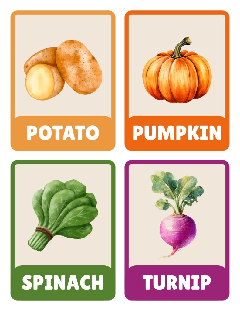 These Vegetable Flashcards for Kids introduce 32 common vegetables through pictures kids can actually recognize. Clear images showing what each vegetable looks like before it gets chopped up and hidden in dinner. No confusing botanical names or scientific classifications. Just the everyday vegetables sitting in grocery stores and growing in gardens that kids need to recognize.