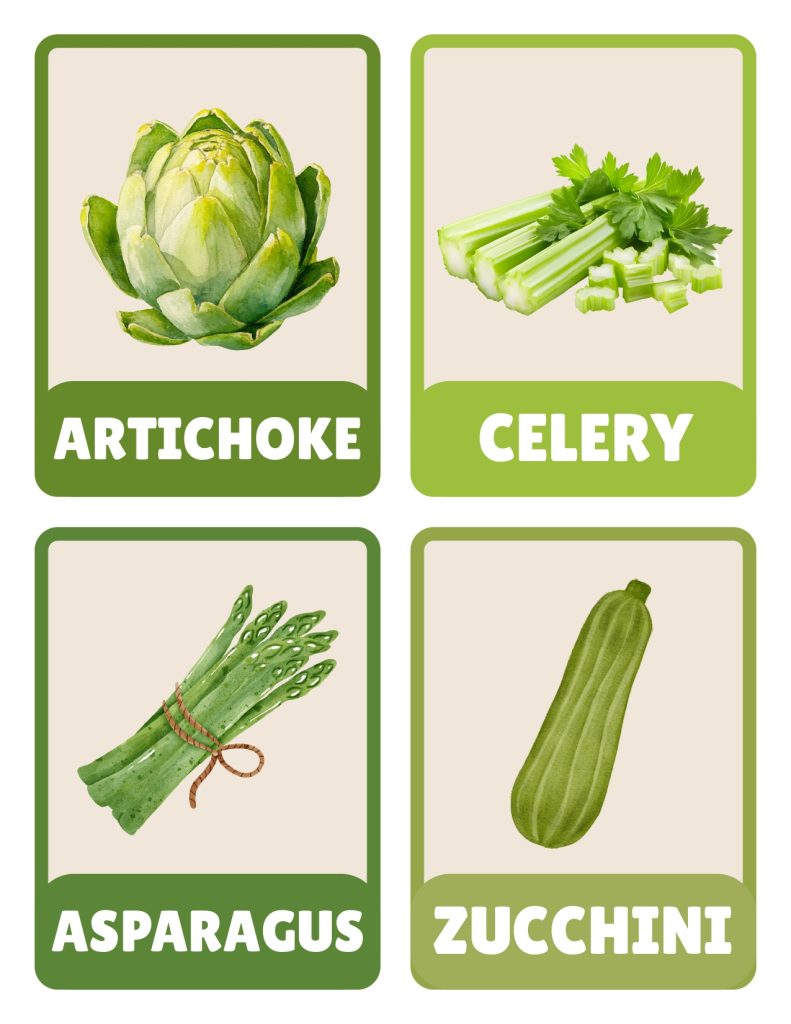 - Alphabet Vegetable Challenge: Go through the alphabet and find vegetables for as many letters as possible using the flashcard set. A is for artichoke and avocado. B is for beetroot and broccoli. This combines literacy practice with vegetable learning.
