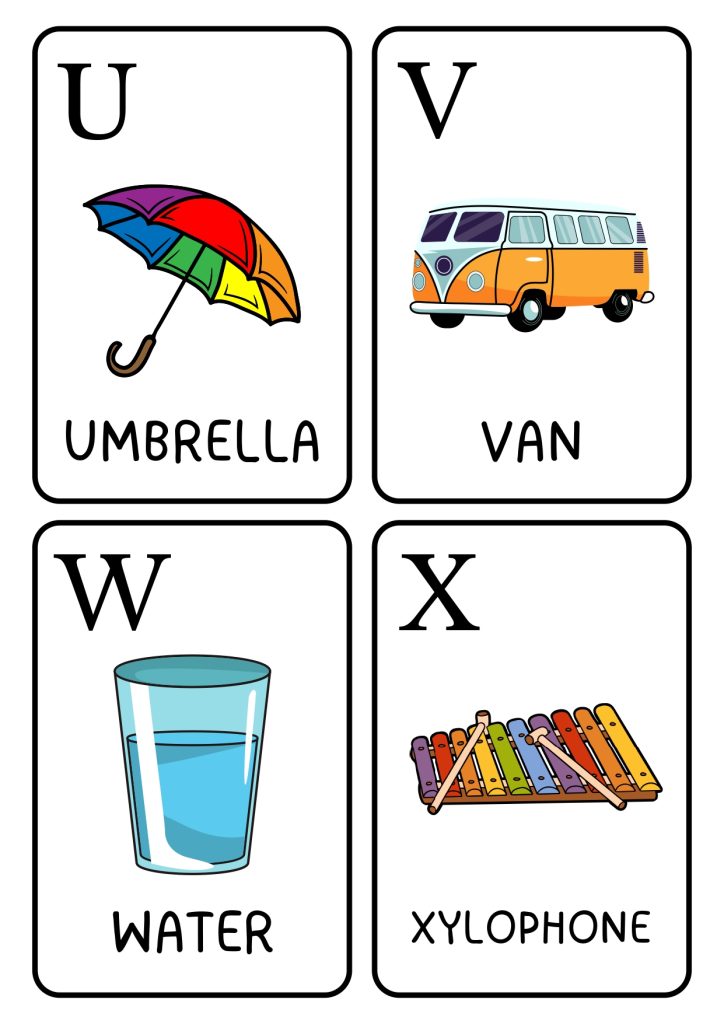 - V for Van connects to those big vehicles that carry lots of people or things.
