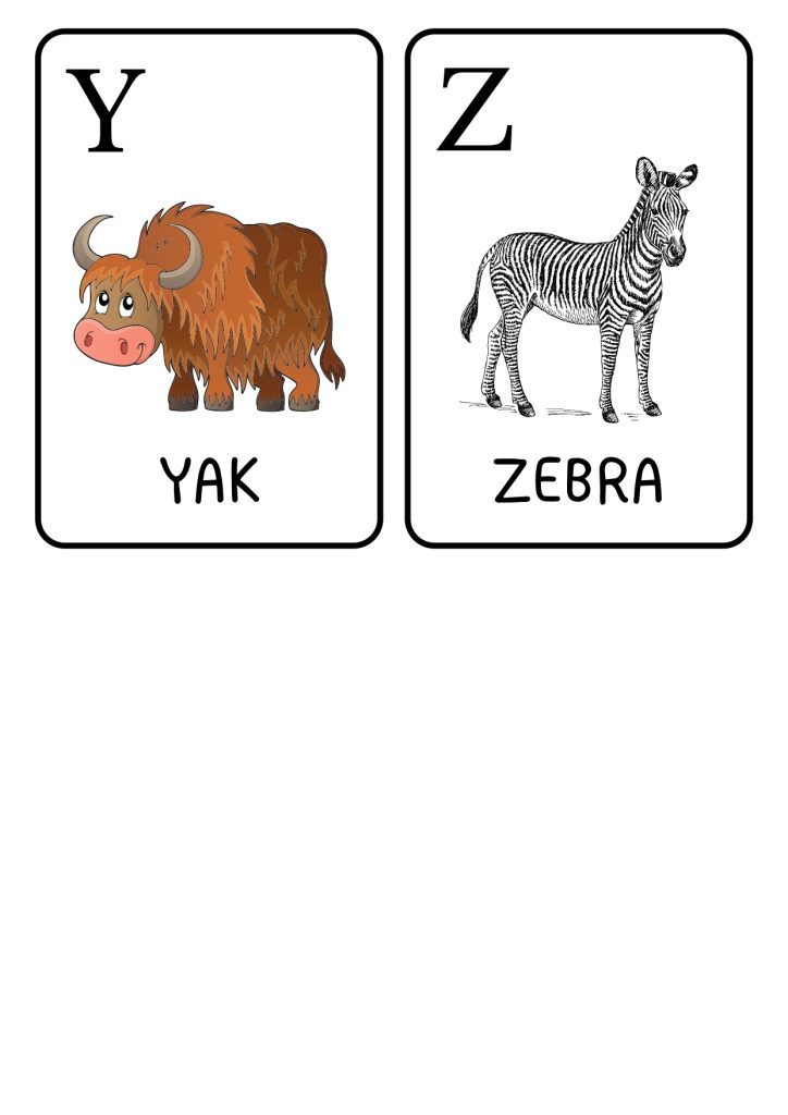 - Y for Yak shows a big, furry animal that looks like a hairy cow.