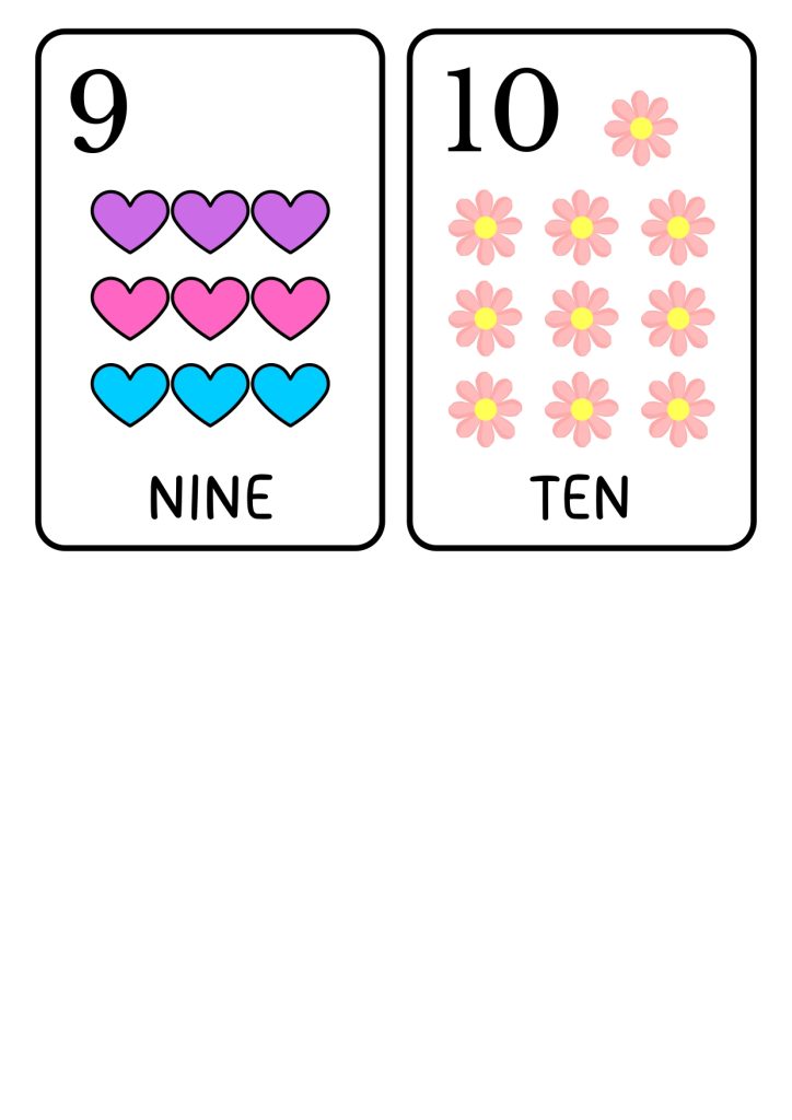 These ten number cards introduce counting from one to ten. Two-year-olds are just starting to understand that numbers mean “how many” of something.
